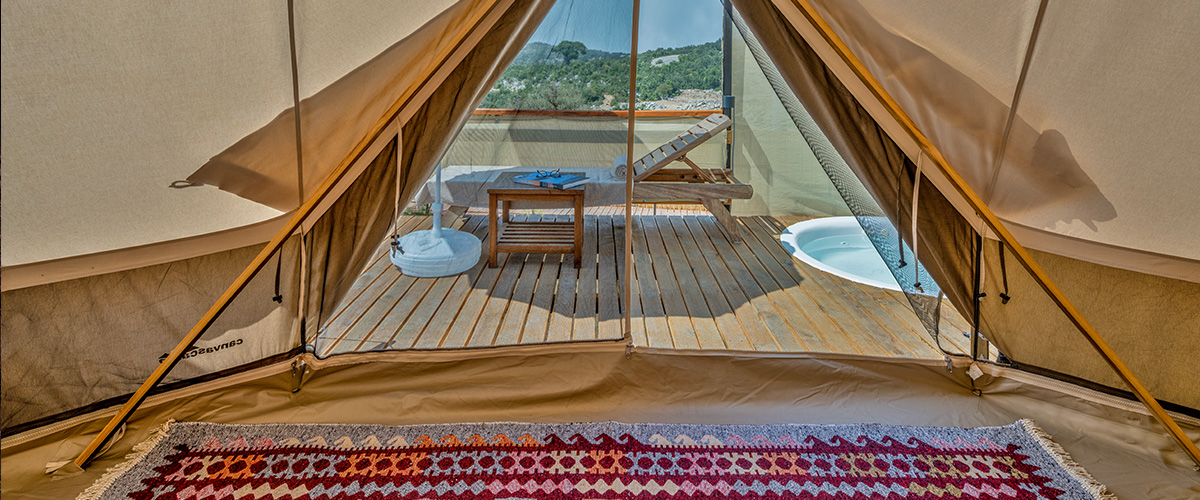 You will stay in canvas glamping tents made of 100% cotton material. Our breathable tents are water and windproof. Inside our 5 m diameter, 3 m high glamping tents with an area of 20 m2;